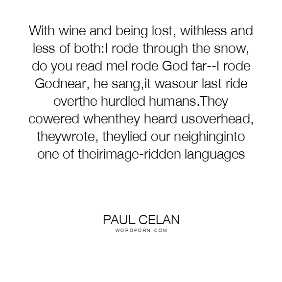 With wine and being lost, withless and less of both:I rode through the snow, do you read meI rode God far--I rode Godnear, he sang,it wasour last ride overthe hurdled humans.They cowered whenthey heard usoverhead, theywrote, theylied our neighinginto one of theirimage-ridden languages