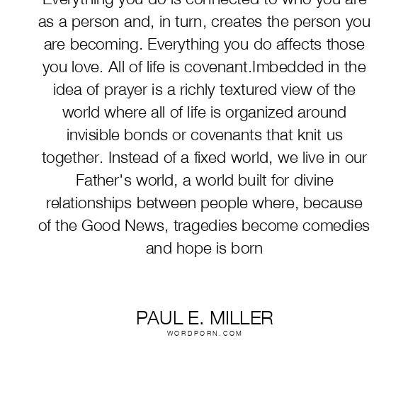 Everything you do is connected to who you are as a person and, in turn, creates the person you are becoming. Everything you do affects those you love. All of life is covenant.Imbedded in the idea of prayer is a richly textured view of the world where all of life is organized around invisible bonds or covenants that knit us together. Instead of a fixed world, we live in our Father's world, a world built for divine relationships between people where, because of the Good News, tragedies become comedies and hope is born