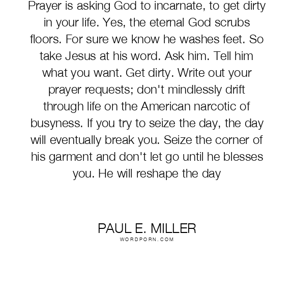 Prayer is asking God to incarnate, to get dirty in your life. Yes, the eternal God scrubs floors. For sure we know he washes feet. So take Jesus at his word. Ask him. Tell him what you want. Get dirty. Write out your prayer requests; don't mindlessly drift through life on the American narcotic of busyness. If you try to seize the day, the day will eventually break you. Seize the corner of his garment and don't let go until he blesses you. He will reshape the day