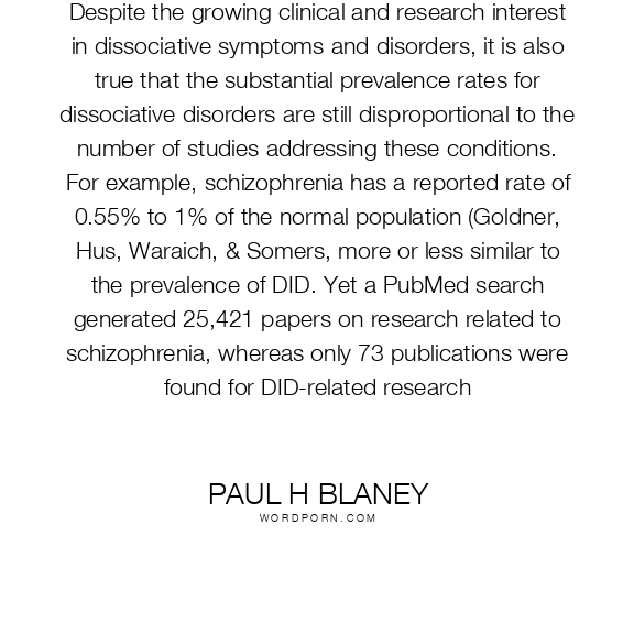 Despite the growing clinical and research interest in dissociative symptoms and disorders, it is also true that the substantial prevalence rates for dissociative disorders are still disproportional to the number of studies addressing these conditions. For example, schizophrenia has a reported rate of 0.55% to 1% of the normal population (Goldner, Hus, Waraich, & Somers, more or less similar to the prevalence of DID. Yet a PubMed search generated 25,421 papers on research related to schizophrenia, whereas only 73 publications were found for DID-related research