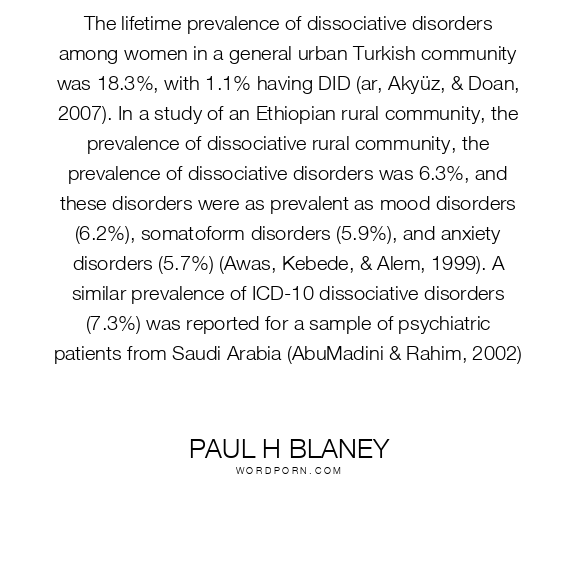The lifetime prevalence of dissociative disorders among women in a general urban Turkish community was 18.3%, with 1.1% having DID (ar, Akyüz, & Doan, 2007). In a study of an Ethiopian rural community, the prevalence of dissociative rural community, the prevalence of dissociative disorders was 6.3%, and these disorders were as prevalent as mood disorders (6.2%), somatoform disorders (5.9%), and anxiety disorders (5.7%) (Awas, Kebede, & Alem, 1999). A similar prevalence of ICD-10 dissociative disorders (7.3%) was reported for a sample of psychiatric patients from Saudi Arabia (AbuMadini & Rahim, 2002)
