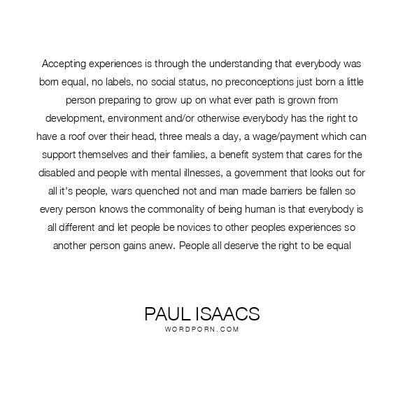 Accepting experiences is through the understanding that everybody was born equal, no labels, no social status, no preconceptions just born a little person preparing to grow-up on what ever path is grown from development, environment and/or otherwise everybody has the right to have a roof over their head, three meals a day, a wage/payment which can support themselves and their families, a benefit system that cares for the disabled and people with mental illnesses, a government that looks out for all it's people, wars quenched not and man made barriers be fallen so every person knows the commonality of being human is that everybody is all different and let people be novices to other peoples experiences so another person gains anew. People all deserve the right to be equal