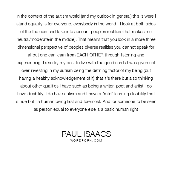 In the context of the autism world (and my outlook in general) this is were I stand equality is for everyone, everybody in the world - I look at both sides of the the coin and take into account peoples realities (that makes me neutral/moderate/in the middle). That means that you look in a more three dimensional perspective of peoples diverse realities you cannot speak for all but one can learn from EACH OTHER through listening and experiencing. I also try my best to live with the good cards I was given not over-investing in my autism being the defining factor of my being (but having a healthy acknowledgement of it) that it's there but also thinking about other qualities I have such as being a writer, poet and artist.I do have disability, I do have autism and I have a "mild" learning disability that is true but I a human being first and foremost. And for someone to be seen as person equal to everyone else is a basic human right