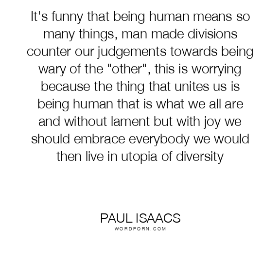 It's funny that being human means so many things, man made divisions counter our judgements towards being wary of the "other", this is worrying because the thing that unites us is being human that is what we all are and without lament but with joy we should embrace everybody we would then live in utopia of diversity