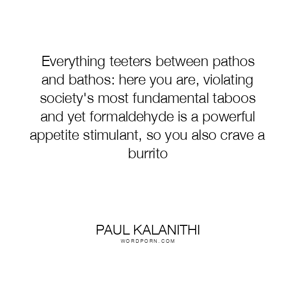 Everything teeters between pathos and bathos: here you are, violating society's most fundamental taboos and yet formaldehyde is a powerful appetite stimulant, so you also crave a burrito
