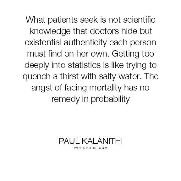 What patients seek is not scientific knowledge that doctors hide but existential authenticity each person must find on her own. Getting too deeply into statistics is like trying to quench a thirst with salty water. The angst of facing mortality has no remedy in probability