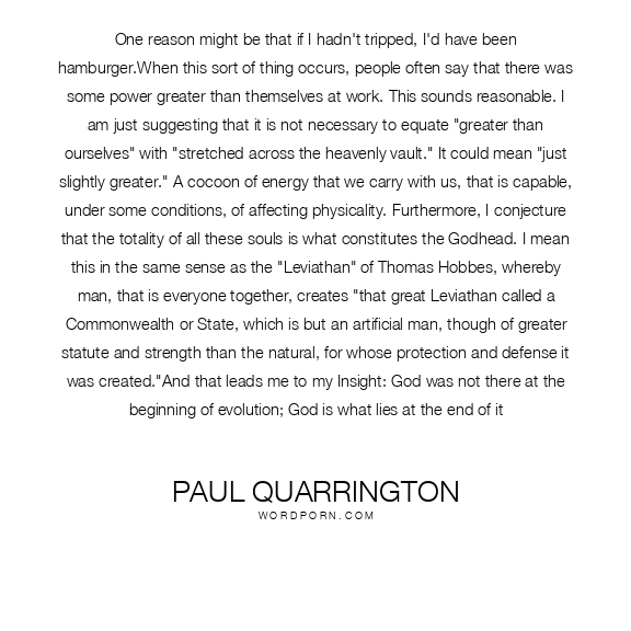 One reason might be that if I hadn't tripped, I'd have been hamburger.When this sort of thing occurs, people often say that there was some power greater than themselves at work. This sounds reasonable. I am just suggesting that it is not necessary to equate "greater than ourselves" with "stretched across the heavenly vault." It could mean "just slightly greater." A cocoon of energy that we carry with us, that is capable, under some conditions, of affecting physicality. Furthermore, I conjecture that the totality of all these souls is what constitutes the Godhead. I mean this in the same sense as the "Leviathan" of Thomas Hobbes, whereby man, that is everyone together, creates "that great Leviathan called a Commonwealth or State, which is but an artificial man, though of greater statute and strength than the natural, for whose protection and defense it was created."And that leads me to my Insight: God was not there at the beginning of evolution; God is what lies at the end of it