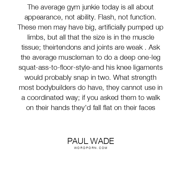 The average gym junkie today is all about appearance, not ability. Flash, not function. These men may have big, artificially pumped up limbs, but all that the size is in the muscle tissue; theirtendons and joints are weak . Ask the average muscleman to do a deep one-leg squat-ass-to-floor-style-and his knee ligaments would probably snap in two. What strength most bodybuilders do have, they cannot use in a coordinated way; if you asked them to walk on their hands they'd fall flat on their faces