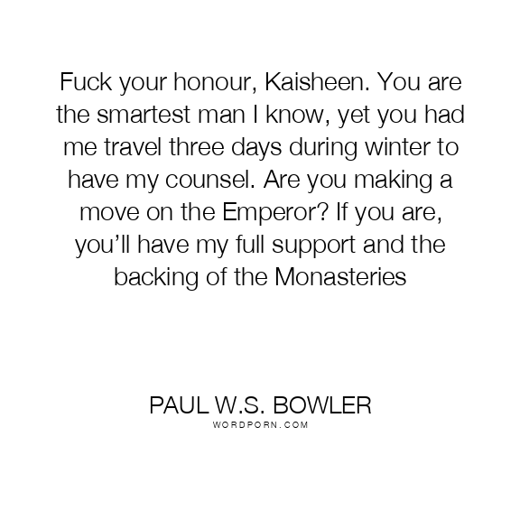 Fuck your honour, Kaisheen. You are the smartest man I know, yet you had me travel three days during winter to have my counsel. Are you making a move on the Emperor? If you are, you’ll have my full support and the backing of the Monasteries