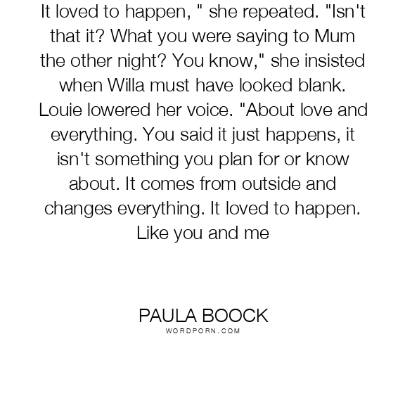 It loved to happen, " she repeated. "Isn't that it? What you were saying to Mum the other night? You know," she insisted when Willa must have looked blank. Louie lowered her voice. "About love and everything. You said it just happens, it isn't something you plan for or know about. It comes from outside and changes everything. It loved to happen. Like you and me