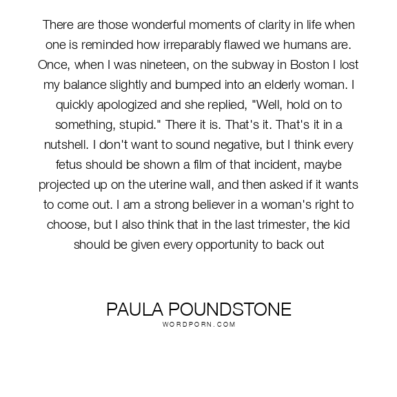 There are those wonderful moments of clarity in life when one is reminded how irreparably flawed we humans are. Once, when I was nineteen, on the subway in Boston I lost my balance slightly and bumped into an elderly woman. I quickly apologized and she replied, "Well, hold on to something, stupid." There it is. That's it. That's it in a nutshell. I don't want to sound negative, but I think every fetus should be shown a film of that incident, maybe projected up on the uterine wall, and then asked if it wants to come out. I am a strong believer in a woman's right to choose, but I also think that in the last trimester, the kid should be given every opportunity to back out