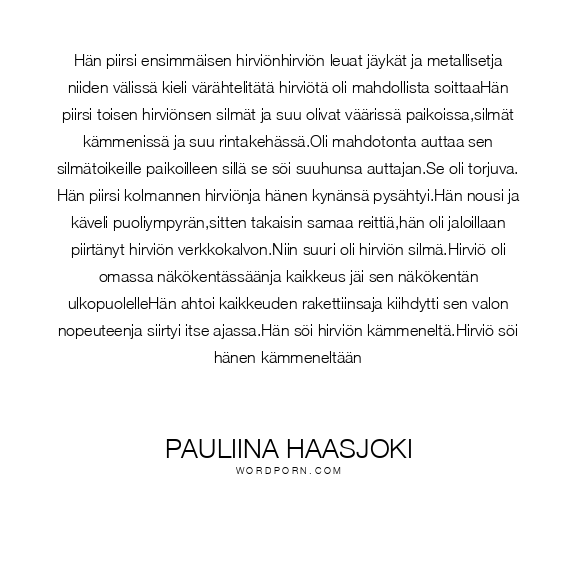 Hän piirsi ensimmäisen hirviönhirviön leuat jäykät ja metallisetja niiden välissä kieli värähtelitätä hirviötä oli mahdollista soittaaHän piirsi toisen hirviönsen silmät ja suu olivat väärissä paikoissa,silmät kämmenissä ja suu rintakehässä.Oli mahdotonta auttaa sen silmätoikeille paikoilleen sillä se söi suuhunsa auttajan.Se oli torjuva. Hän piirsi kolmannen hirviönja hänen kynänsä pysähtyi.Hän nousi ja käveli puoliympyrän,sitten takaisin samaa reittiä,hän oli jaloillaan piirtänyt hirviön verkkokalvon.Niin suuri oli hirviön silmä.Hirviö oli omassa näkökentässäänja kaikkeus jäi sen näkökentän ulkopuolelleHän ahtoi kaikkeuden rakettiinsaja kiihdytti sen valon nopeuteenja siirtyi itse ajassa.Hän söi hirviön kämmeneltä.Hirviö söi hänen kämmeneltään