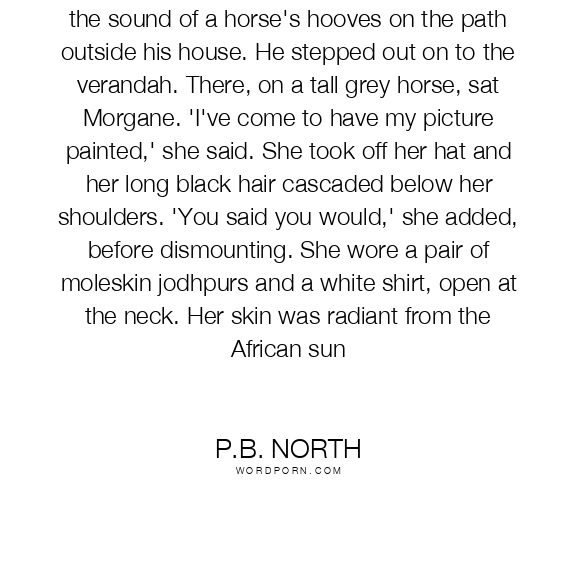 One morning, as he sat at his desk, he heard the sound of a horse's hooves on the path outside his house. He stepped out on to the verandah. There, on a tall grey horse, sat Morgane. 'I've come to have my picture painted,' she said. She took off her hat and her long black hair cascaded below her shoulders. 'You said you would,' she added, before dismounting. She wore a pair of moleskin jodhpurs and a white shirt, open at the neck. Her skin was radiant from the African sun