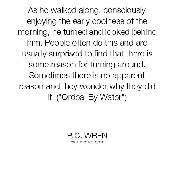 As he walked along, consciously enjoying the early coolness of the morning, he turned and looked behind him. People often do this and are usually surprised to find that there is some reason for turning around. Sometimes there is no apparent reason and they wonder why they did it. ("Ordeal By Water")