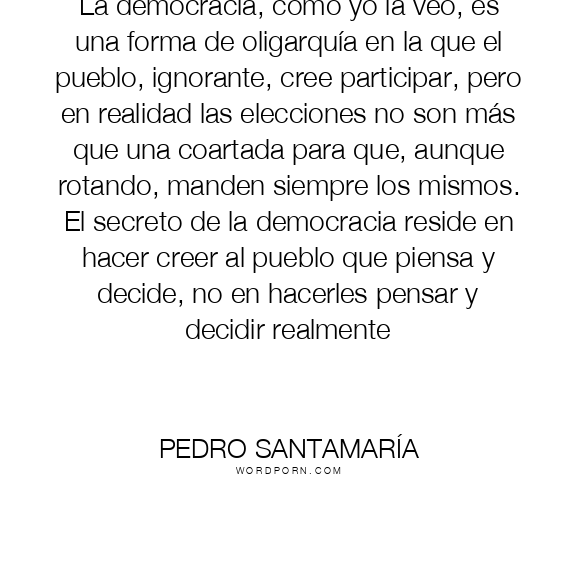 La democracia, como yo la veo, es una forma de oligarquía en la que el pueblo, ignorante, cree participar, pero en realidad las elecciones no son más que una coartada para que, aunque rotando, manden siempre los mismos. El secreto de la democracia reside en hacer creer al pueblo que piensa y decide, no en hacerles pensar y decidir realmente