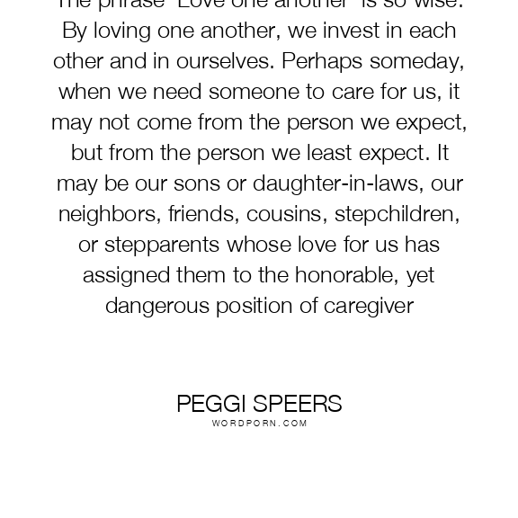 The phrase 'Love one another' is so wise. By loving one another, we invest in each other and in ourselves. Perhaps someday, when we need someone to care for us, it may not come from the person we expect, but from the person we least expect. It may be our sons or daughter-in-laws, our neighbors, friends, cousins, stepchildren, or stepparents whose love for us has assigned them to the honorable, yet dangerous position of caregiver