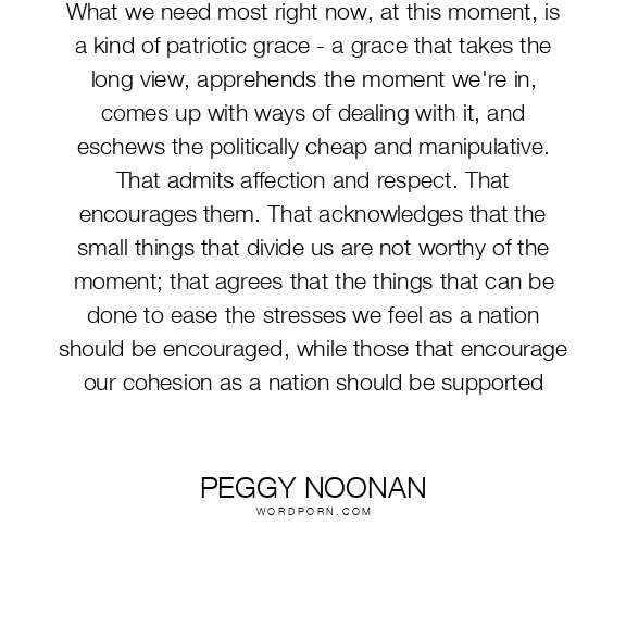What we need most right now, at this moment, is a kind of patriotic grace - a grace that takes the long view, apprehends the moment we're in, comes up with ways of dealing with it, and eschews the politically cheap and manipulative. That admits affection and respect. That encourages them. That acknowledges that the small things that divide us are not worthy of the moment; that agrees that the things that can be done to ease the stresses we feel as a nation should be encouraged, while those that encourage our cohesion as a nation should be supported
