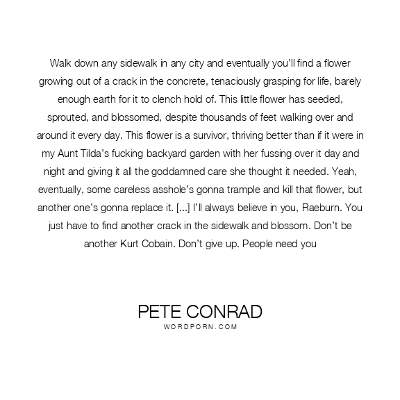 Walk down any sidewalk in any city and eventually you’ll find a flower growing out of a crack in the concrete, tenaciously grasping for life, barely enough earth for it to clench hold of. This little flower has seeded, sprouted, and blossomed, despite thousands of feet walking over and around it every day. This flower is a survivor, thriving better than if it were in my Aunt Tilda’s fucking backyard garden with her fussing over it day and night and giving it all the goddamned care she thought it needed. Yeah, eventually, some careless asshole’s gonna trample and kill that flower, but another one’s gonna replace it. [...] I’ll always believe in you, Raeburn. You just have to find another crack in the sidewalk and blossom. Don’t be another Kurt Cobain. Don’t give up. People need you
