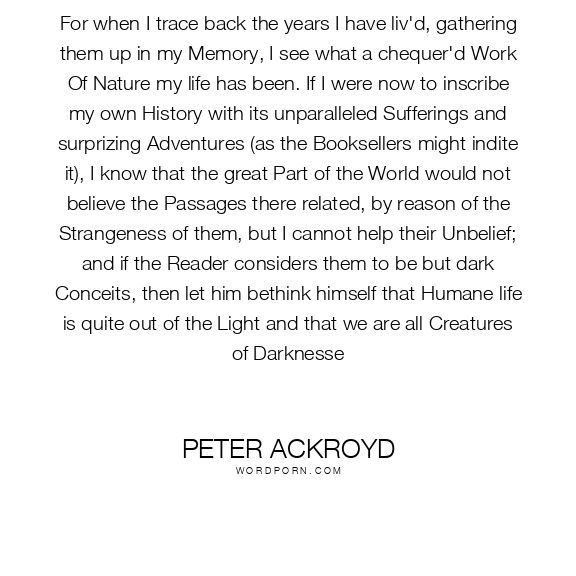 For when I trace back the years I have liv'd, gathering them up in my Memory, I see what a chequer'd Work Of Nature my life has been. If I were now to inscribe my own History with its unparalleled Sufferings and surprizing Adventures (as the Booksellers might indite it), I know that the great Part of the World would not believe the Passages there related, by reason of the Strangeness of them, but I cannot help their Unbelief; and if the Reader considers them to be but dark Conceits, then let him bethink himself that Humane life is quite out of the Light and that we are all Creatures of Darknesse