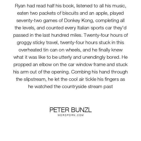 Ryan had read half his book, listened to all his music, eaten two packets of biscuits and an apple, played seventy-two games of Donkey Kong, completing all the levels, and counted every Italian sports car they’d passed in the last hundred miles. Twenty-four hours of groggy sticky travel, twenty-four hours stuck in this overheated tin can on wheels, and he finally knew what it was like to be utterly and unendingly bored. He propped an elbow on the car window frame and stuck his arm out of the opening. Combing his hand through the slipstream, he let the cool air tickle his fingers as he watched the countryside stream past
