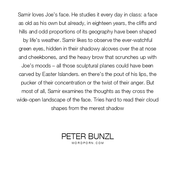Samir loves Joe’s face. He studies it every day in class: a face as old as his own but already, in eighteen years, the cliffs and hills and odd proportions of its geography have been shaped by life’s weather. Samir likes to observe the ever-watchful green eyes, hidden in their shadowy alcoves over the at nose and cheekbones, and the heavy brow that scrunches up with Joe’s moods – all those sculptural planes could have been carved by Easter Islanders. en there’s the pout of his lips, the pucker of their concentration or the twist of their anger. But most of all, Samir examines the thoughts as they cross the wide-open landscape of the face. Tries hard to read their cloud shapes from the merest shadow