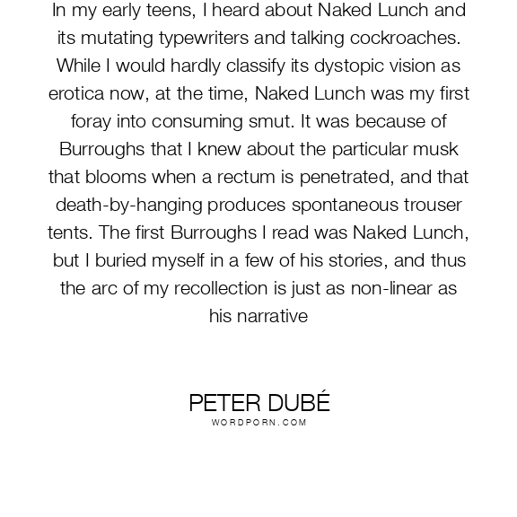 In my early teens, I heard about Naked Lunch and its mutating typewriters and talking cockroaches. While I would hardly classify its dystopic vision as erotica now, at the time, Naked Lunch was my first foray into consuming smut. It was because of Burroughs that I knew about the particular musk that blooms when a rectum is penetrated, and that death-by-hanging produces spontaneous trouser tents. The first Burroughs I read was Naked Lunch, but I buried myself in a few of his stories, and thus the arc of my recollection is just as non-linear as his narrative