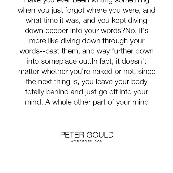 Have you ever been writing something when you just forgot where you were, and what time it was, and you kept diving down deeper into your words?No, it's more like diving down through your words--past them, and way further down into someplace out.In fact, it doesn't matter whether you're naked or not, since the next thing is, you leave your body totally behind and just go off into your mind. A whole other part of your mind