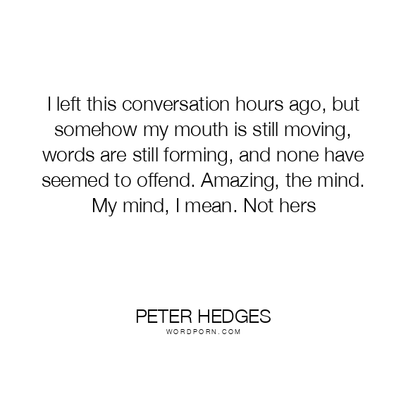 I left this conversation hours ago, but somehow my mouth is still moving, words are still forming, and none have seemed to offend. Amazing, the mind. My mind, I mean. Not hers