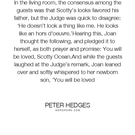 In the living room, the consensus among the guests was that Scotty’s looks favored his father, but the Judge was quick to disagree: ‘He doesn’t look a thing like me. He looks like an hors d'oeuvre.’Hearing this, Joan thought the following, and pledged it to herself, as both prayer and promise: You will be loved, Scotty Ocean.And while the guests laughed at the Judge’s remark, Joan leaned over and softly whispered to her newborn son, 'You will be loved