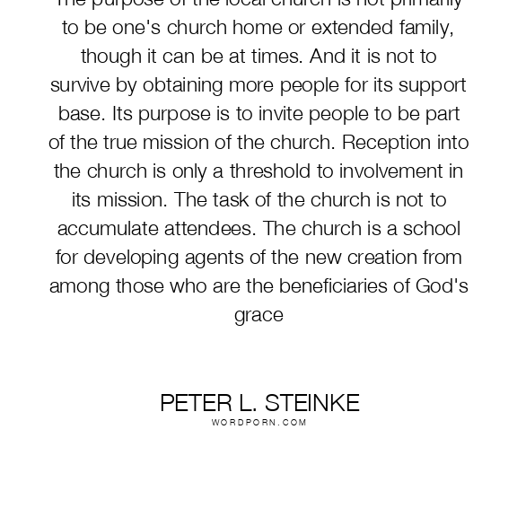 The purpose of the local church is not primarily to be one's church home or extended family, though it can be at times. And it is not to survive by obtaining more people for its support base. Its purpose is to invite people to be part of the true mission of the church. Reception into the church is only a threshold to involvement in its mission. The task of the church is not to accumulate attendees. The church is a school for developing agents of the new creation from among those who are the beneficiaries of God's grace