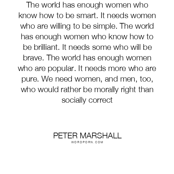 The world has enough women who know how to be smart. It needs women who are willing to be simple. The world has enough women who know how to be brilliant. It needs some who will be brave. The world has enough women who are popular. It needs more who are pure. We need women, and men, too, who would rather be morally right than socially correct