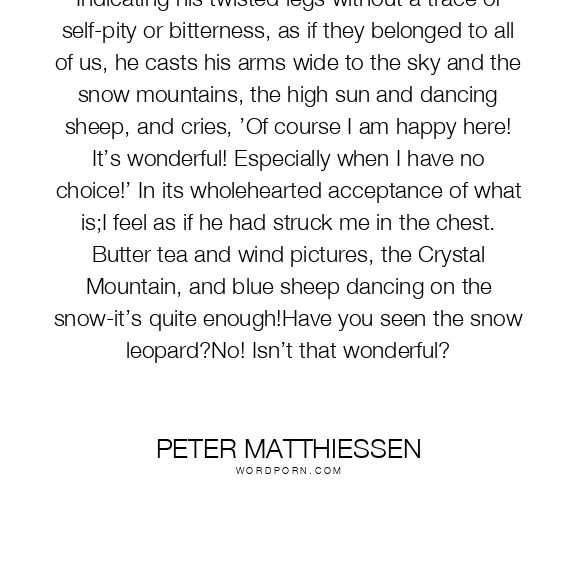 Indicating his twisted legs without a trace of self-pity or bitterness, as if they belonged to all of us, he casts his arms wide to the sky and the snow mountains, the high sun and dancing sheep, and cries, ’Of course I am happy here! It’s wonderful! Especially when I have no choice!’ In its wholehearted acceptance of what is;I feel as if he had struck me in the chest. Butter tea and wind pictures, the Crystal Mountain, and blue sheep dancing on the snow-it’s quite enough!Have you seen the snow leopard?No! Isn’t that wonderful?