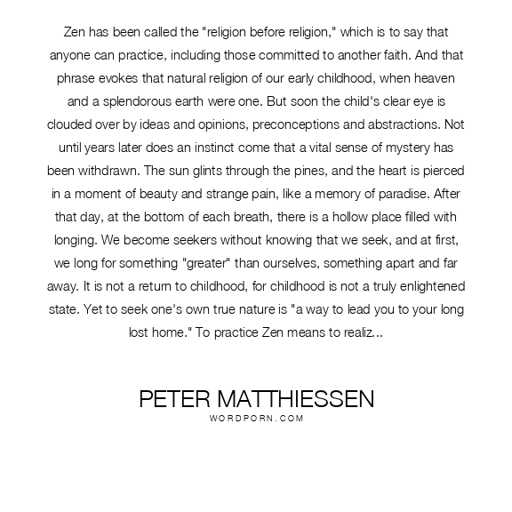 Zen has been called the "religion before religion," which is to say that anyone can practice, including those committed to another faith. And that phrase evokes that natural religion of our early childhood, when heaven and a splendorous earth were one. But soon the child's clear eye is clouded over by ideas and opinions, preconceptions and abstractions. Not until years later does an instinct come that a vital sense of mystery has been withdrawn. The sun glints through the pines, and the heart is pierced in a moment of beauty and strange pain, like a memory of paradise. After that day, at the bottom of each breath, there is a hollow place filled with longing. We become seekers without knowing that we seek, and at first, we long for something "greater" than ourselves, something apart and far away. It is not a return to childhood, for childhood is not a truly enlightened state. Yet to seek one's own true nature is "a way to lead you to your long lost home." To practice Zen means to realize one's existence moment after moment, rather than letting life unravel in regret of the past and daydreaming of the future. To "rest in the present" is a state of magical simplicity...out of the emptiness can come a true insight into our natural harmony all creation. To travel this path, one need not be a 'Zen Buddhist', which is only another idea to be discarded like 'enlightenment,' and like 'the Buddha' and like 'God