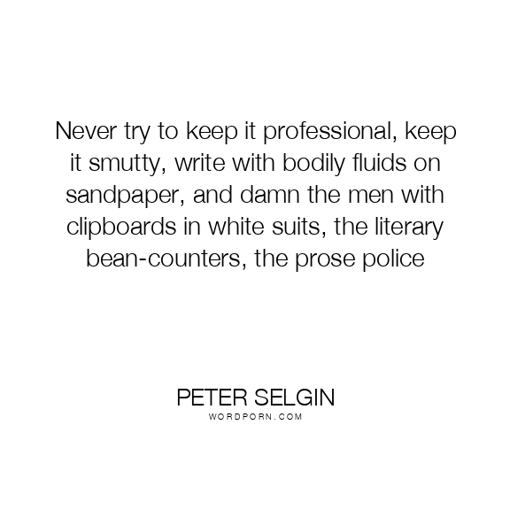 Never try to keep it professional, keep it smutty, write with bodily fluids on sandpaper, and damn the men with clipboards in white suits, the literary bean-counters, the prose police
