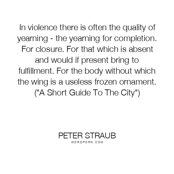 In violence there is often the quality of yearning - the yearning for completion. For closure. For that which is absent and would if present bring to fulfillment. For the body without which the wing is a useless frozen ornament. ("A Short Guide To The City")