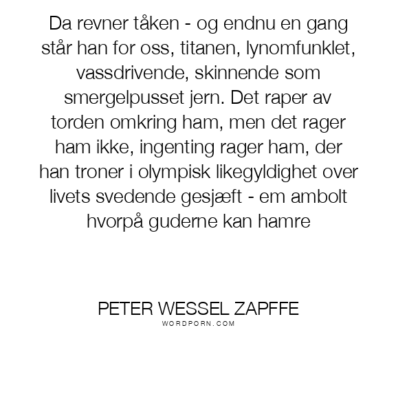 Da revner tåken - og endnu en gang står han for oss, titanen, lynomfunklet, vassdrivende, skinnende som smergelpusset jern. Det raper av torden omkring ham, men det rager ham ikke, ingenting rager ham, der han troner i olympisk likegyldighet over livets svedende gesjæft - em ambolt hvorpå guderne kan hamre