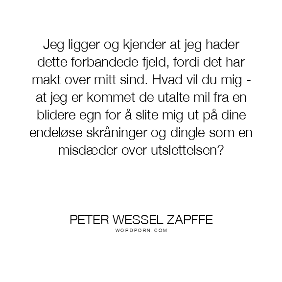 Jeg ligger og kjender at jeg hader dette forbandede fjeld, fordi det har makt over mitt sind. Hvad vil du mig - at jeg er kommet de utalte mil fra en blidere egn for å slite mig ut på dine endeløse skråninger og dingle som en misdæder over utslettelsen?