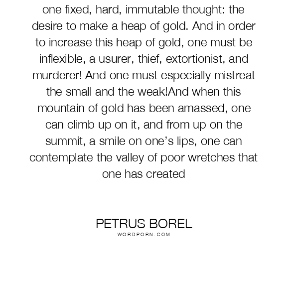 To get rich, one must have but a single idea, one fixed, hard, immutable thought: the desire to make a heap of gold. And in order to increase this heap of gold, one must be inflexible, a usurer, thief, extortionist, and murderer! And one must especially mistreat the small and the weak!And when this mountain of gold has been amassed, one can climb up on it, and from up on the summit, a smile on one’s lips, one can contemplate the valley of poor wretches that one has created