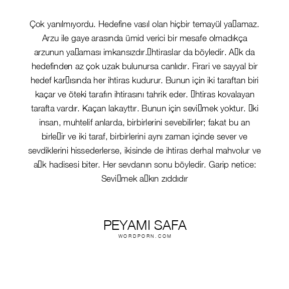 Çok yanılmıyordu. Hedefine vasıl olan hiçbir temayül yaşamaz. Arzu ile gaye arasında ümid verici bir mesafe olmadıkça arzunun yaşaması imkansızdır.İhtiraslar da böyledir. Aşk da hedefinden az çok uzak bulunursa canlıdır. Firari ve sayyal bir hedef karşısında her ihtiras kudurur. Bunun için iki taraftan biri kaçar ve öteki tarafın ihtirasını tahrik eder. İhtiras kovalayan tarafta vardır. Kaçan lakayttır. Bunun için sevişmek yoktur. İki insan, muhtelif anlarda, birbirlerini sevebilirler; fakat bu an birleşir ve iki taraf, birbirlerini aynı zaman içinde sever ve sevdiklerini hissederlerse, ikisinde de ihtiras derhal mahvolur ve aşk hadisesi biter. Her sevdanın sonu böyledir. Garip netice: Sevişmek aşkın zıddıdır