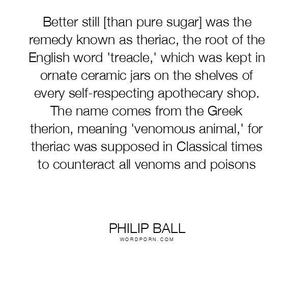 Better still [than pure sugar] was the remedy known as theriac, the root of the English word 'treacle,' which was kept in ornate ceramic jars on the shelves of every self-respecting apothecary shop. The name comes from the Greek therion, meaning 'venomous animal,' for theriac was supposed in Classical times to counteract all venoms and poisons