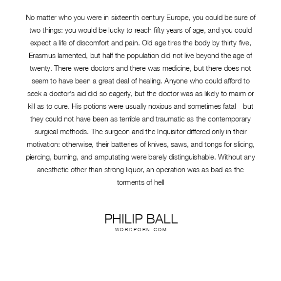 No matter who you were in sixteenth-century Europe, you could be sure of two things: you would be lucky to reach fifty years of age, and you could expect a life of discomfort and pain. Old age tires the body by thirty-five, Erasmus lamented, but half the population did not live beyond the age of twenty. There were doctors and there was medicine, but there does not seem to have been a great deal of healing. Anyone who could afford to seek a doctor's aid did so eagerly, but the doctor was as likely to maim or kill as to cure. His potions were usually noxious and sometimes fatal—but they could not have been as terrible and traumatic as the contemporary surgical methods. The surgeon and the Inquisitor differed only in their motivation: otherwise, their batteries of knives, saws, and tongs for slicing, piercing, burning, and amputating were barely distinguishable. Without any anesthetic other than strong liquor, an operation was as bad as the torments of hell