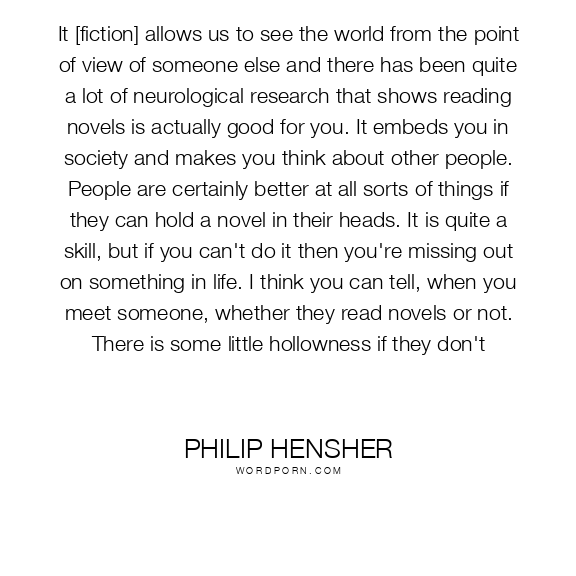 It [fiction] allows us to see the world from the point of view of someone else and there has been quite a lot of neurological research that shows reading novels is actually good for you. It embeds you in society and makes you think about other people. People are certainly better at all sorts of things if they can hold a novel in their heads. It is quite a skill, but if you can't do it then you're missing out on something in life. I think you can tell, when you meet someone, whether they read novels or not. There is some little hollowness if they don't