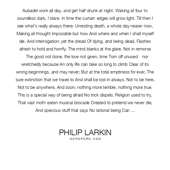 AubadeI work all day, and get half-drunk at night. Waking at four to soundless dark, I stare. In time the curtain-edges will grow light. Till then I see what’s really always there: Unresting death, a whole day nearer now, Making all thought impossible but how And where and when I shall myself die. Arid interrogation: yet the dread Of dying, and being dead, Flashes afresh to hold and horrify. The mind blanks at the glare. Not in remorse —The good not done, the love not given, time Torn off unused—nor wretchedly because An only life can take so long to climb Clear of its wrong beginnings, and may never; But at the total emptiness for ever, The sure extinction that we travel to And shall be lost in always. Not to be here, Not to be anywhere, And soon; nothing more terrible, nothing more true. This is a special way of being afraid No trick dispels. Religion used to try, That vast moth-eaten musical brocade Created to pretend we never die, And specious stuff that says No rational being Can fear a thing it will not feel, not seeing That this is what we fear—no sight, no sound, No touch or taste or smell, nothing to think with, Nothing to love or link with, The anaesthetic from which none come round. And so it stays just on the edge of vision, A small unfocused blur, a standing chill That slows each impulse down to indecision. Most things may never happen: this one will, And realisation of it rages out In furnace-fear when we are caught without People or drink. Courage is no good: It means not scaring others. Being brave Lets no one off the grave. Death is no different whined at than withstood. Slowly light strengthens, and the room takes shape. It stands plain as a wardrobe, what we know, Have always known, know that we can’t escape, Yet can’t accept. One side will have to go. Meanwhile telephones crouch, getting ready to ring In locked-up offices, and all the uncaring Intricate rented world begins to rouse. The sky is white as clay, with no sun. Work has to be done. Postmen like doctors go from house to house