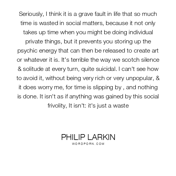 Seriously, I think it is a grave fault in life that so much time is wasted in social matters, because it not only takes up time when you might be doing individual private things, but it prevents you storing up the psychic energy that can then be released to create art or whatever it is. It's terrible the way we scotch silence & solitude at every turn, quite suicidal. I can't see how to avoid it, without being very rich or very unpopular, & it does worry me, for time is slipping by , and nothing is done. It isn't as if anything was gained by this social frivolity, It isn't: it's just a waste