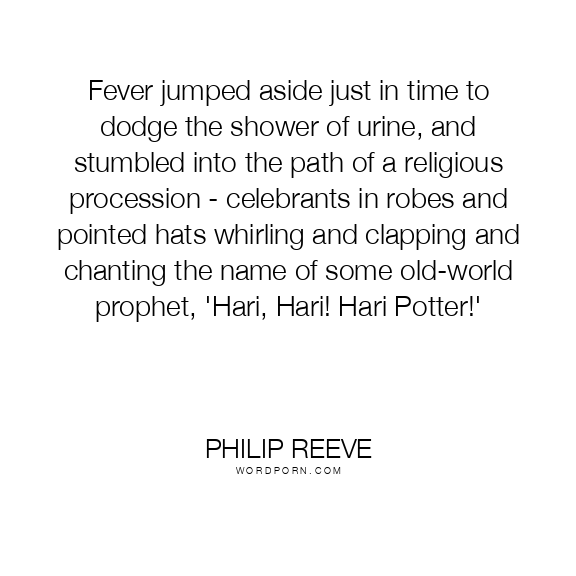 Fever jumped aside just in time to dodge the shower of urine, and stumbled into the path of a religious procession - celebrants in robes and pointed hats whirling and clapping and chanting the name of some old-world prophet, 'Hari, Hari! Hari Potter!'