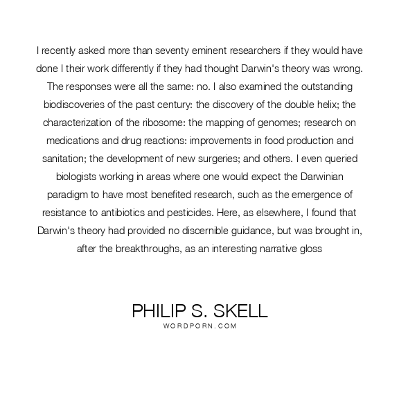 I recently asked more than seventy eminent researchers if they would have done I their work differently if they had thought Darwin's theory was wrong. The responses were all the same: no. I also examined the outstanding biodiscoveries of the past century: the discovery of the double helix; the characterization of the ribosome: the mapping of genomes; research on medications and drug reactions: improvements in food production and sanitation; the development of new surgeries; and others. I even queried biologists working in areas where one would expect the Darwinian paradigm to have most benefited research, such as the emergence of resistance to antibiotics and pesticides. Here, as elsewhere, I found that Darwin's theory had provided no discernible guidance, but was brought in, after the breakthroughs, as an interesting narrative gloss