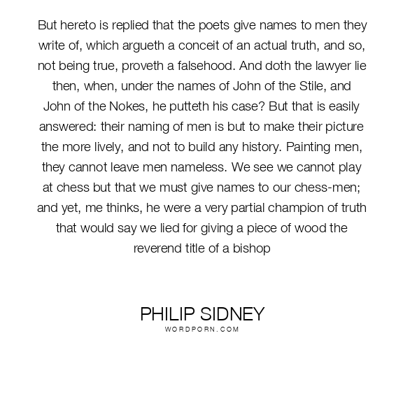 But hereto is replied that the poets give names to men they write of, which argueth a conceit of an actual truth, and so, not being true, proveth a falsehood. And doth the lawyer lie then, when, under the names of John of the Stile, and John of the Nokes, he putteth his case? But that is easily answered: their naming of men is but to make their picture the more lively, and not to build any history. Painting men, they cannot leave men nameless. We see we cannot play at chess but that we must give names to our chess-men; and yet, me thinks, he were a very partial champion of truth that would say we lied for giving a piece of wood the reverend title of a bishop