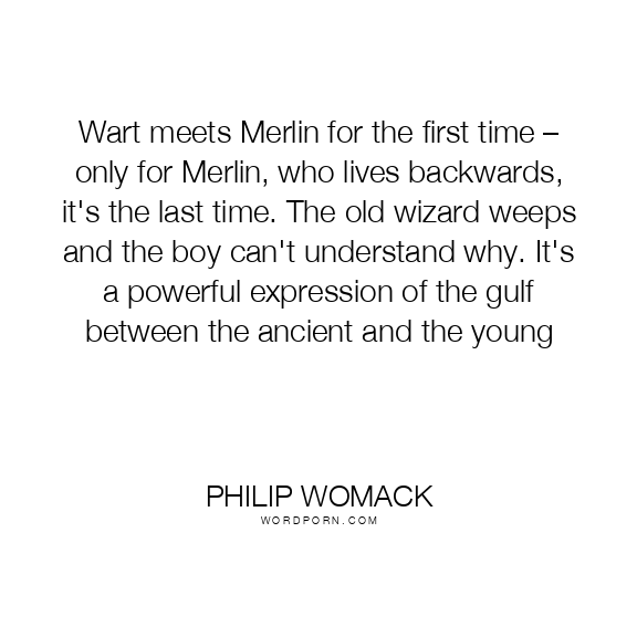 Wart meets Merlin for the first time – only for Merlin, who lives backwards, it's the last time. The old wizard weeps and the boy can't understand why. It's a powerful expression of the gulf between the ancient and the young