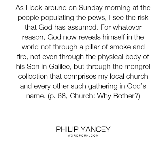 As I look around on Sunday morning at the people populating the pews, I see the risk that God has assumed. For whatever reason, God now reveals himself in the world not through a pillar of smoke and fire, not even through the physical body of his Son in Galilee, but through the mongrel collection that comprises my local church and every other such gathering in God’s name. (p. 68, Church: Why Bother?)