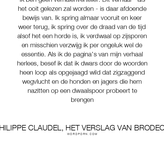 Ik ben geen verhalenverteller. Dit verhaal - als het ooit gelezen zal worden - is daar afdoende bewijs van. Ik spring almaar vooruit en keer weer terug, ik spring over de draad van de tijd alsof het een horde is, ik verdwaal op zijsporen en misschien verzwijg ik per ongeluk wel de essentie. Als ik de pagina's van mijn verhaal herlees, besef ik dat ik dwars door de woorden heen loop als opgejaagd wild dat zigzaggend wegvlucht en de honden en jagers die hem nazitten op een dwaalspoor probeert te brengen